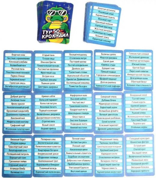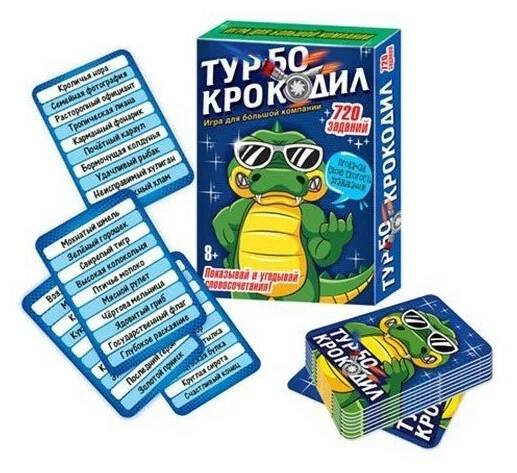 «Турбо-крокодил» - отличная настольная игра для большой компании! Правила игры очень просты – за определенное время игрокам предстоит отгадать, как можно слов при помощи движения своего тела, используя специальные прилагательные-подсказки. Игрок зачитывает вслух прилагательное, а далее благодаря пантомимы показывает второе слова.