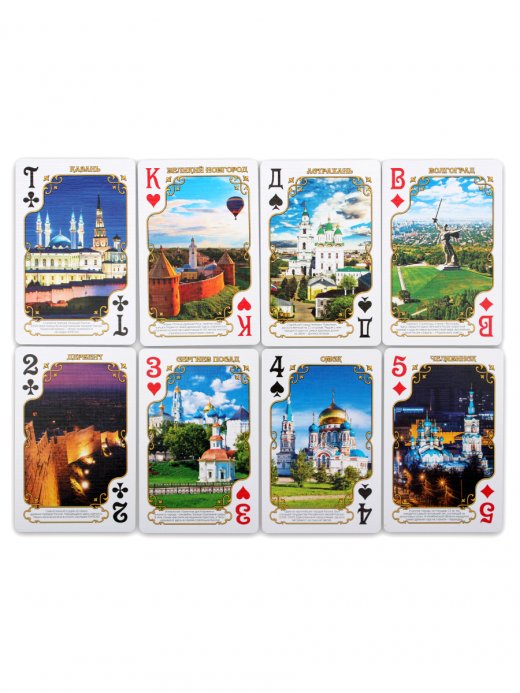 Красочная колода из 54 игральных карт бриджевого формата. Включает в себя самые значительные и интересные города России с познавательными фактами о них. Набор позволит увлекательно провести часы досуга и узнать много нового о необъятной стране.