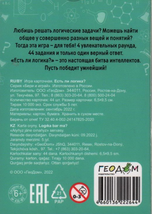 и Карточная игра «Есть ли логика?» - игра для тех, кто любит решать логические задачи! Захватывающий поединок для игры в компании и вдвоем, подходящий для взрослых и детей.