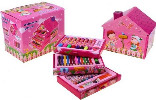 Состав набора: фломастеры 8 штук, цветные карандаши 12 штук, восковые карандаши 12 штук, ластик, точилка, клей, зажим.