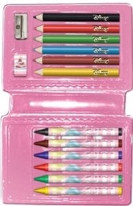 Состав набора: 6 цветных карандашей, 6 восковых карандашей, точилка, ластик и раскраска.