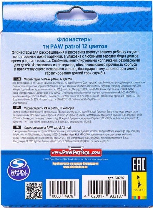 Купить Фломастеры Собачий патруль 12 цветов в Новосибирске Вы можете в магазине развивающих и настольных игр "Игры Почемучек"