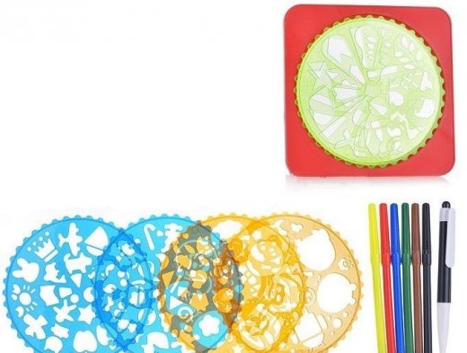 Набор конструктор для рисования – это детская игрушка, состоит из пластмассовой пластины с вырезанными кругами разных диаметров и различными фигурами, которые так любят дети. Рисовать спирографом довольно просто - пластина прикладывается к листу бумаги, внутрь отверстия помещается одно из зубчатых колёс, в одно из отверстий которого вставляется шариковая ручка или карандаш, и обводится фигурка.