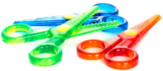 В наборе 3 пары ножниц: зеленого, синего и красного цветов. У каждых лезвия индивидуальной формы: красные позволяют получить при вырезании прямой край, синие - волнообразный, а зеленые - зигзагообразный. Ножницы выполнены из пластика и абсолютно безопасны для детей. Благодаря эргономичным ручкам они удобны в применении.