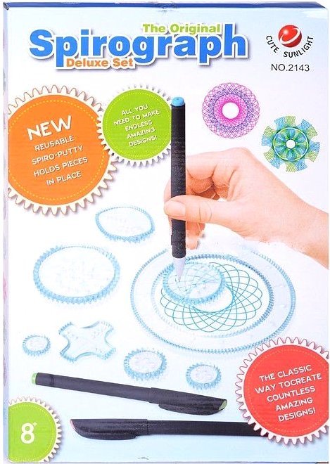 Спирограф Deluxe Set – обязательно понравится как совсем малышу, так и ребенку школьнику. С помощью нее можно рисовать различные фигуры и узоры, какие только придут или возникнут в голове и, кстати, без особого труда и напряжения для кисти руки. Спирограф накладывается на лист бумаги, внутрь отверстия помещается одно из колес, в одно из отверстий которого вставляется ручка или карандаш. С помощью вращательных движений руки колесо приводится в движение, и на бумаге вырисовывается спиралевидный узор. Разные отверстия в колесе позволяют получить фигуры разной формы. Если рисовать разноцветными карандашами или ручками - у фигурок появляется визуальный объем.