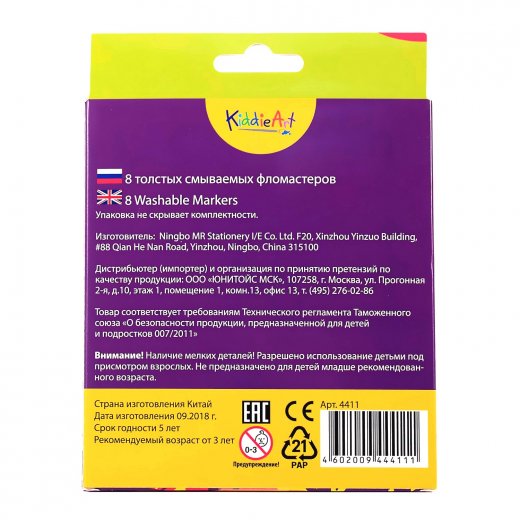 Каждый ребёнок обожает рисовать! А с новыми смываемыми фломастерами создавать шедевры одно удовольствие! KiddieArt Толстые смываемые фломастеры порадует ребенка, а вас избавит от ошибок его творчества. Ведь специальный состав фломастеров поможет смыть рисунки практически с любой поверхности, используя обычную воду. В картонной коробке 8 разноцветных фломастеров.