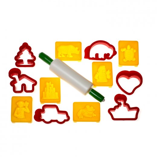 В наборе формы для лепки 12 шт (6 односторонних и 6 сквозных) и скалка. Скалка поможет раскатать материал для лепки, а формочки превратят процесс лепки в увлекательную игру для ребенка.