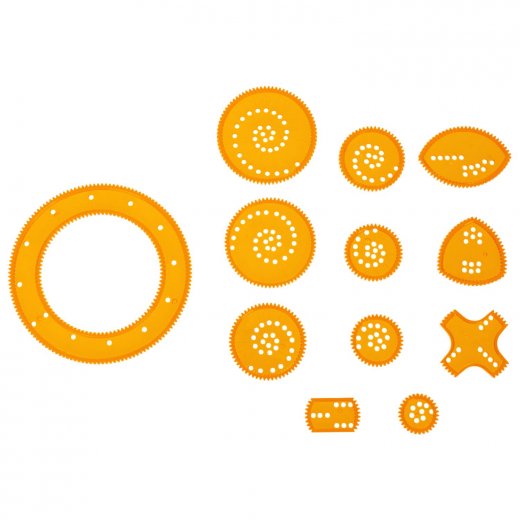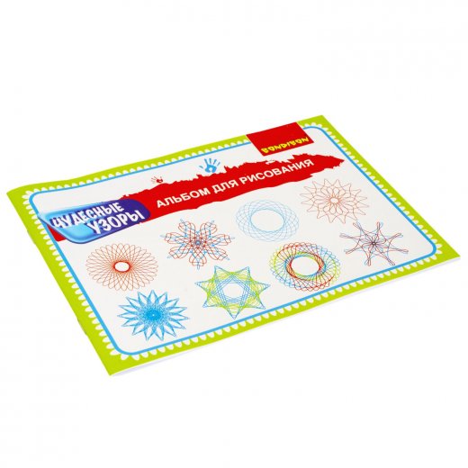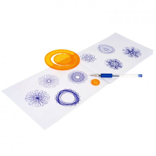В комплекте: спирограф, 11 фигурных вкладыша, альбом для рисования и ручка.