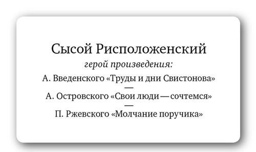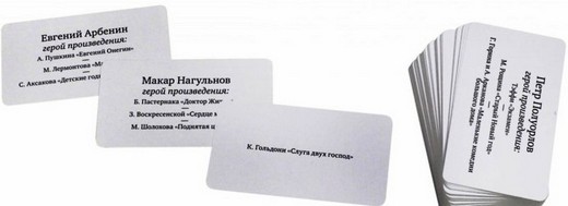 Игра представляет собой набор из 120-ти двусторонних карточек. На лицевой стороне каждой карточки - имя литературного героя и три варианта литературных произведений, героем только одного из которых является указанный персонаж. Необходимо догадаться, какого именно и, перевернув карточку, проверить себя. Полиграфическое исполнение аналогичное предыдущим проектам студии pagedown - "Ерундопель русского языка", "Ударник литературной речи" и т.д.