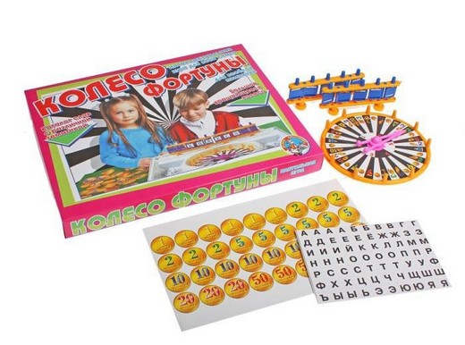Настольная игра Колесо Фортуны содержиттысячу самых разных слов в каталоге, 44 занимательные темы для разносторонних вопросов. Игру можно проводить по двум вариантам. Каждый из которых подробно описан во вложенных в коробку правилах игры. В качестве того самого колеса фортуны выступает барабан.