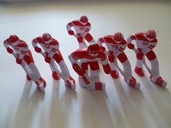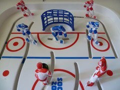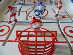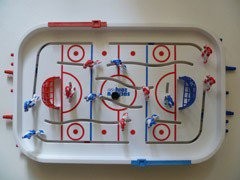 Игровое поле прекрасно умещается на небольшом столе. Хоккеисты управляются вращением и передвижением ручек с металлическими спицами.
