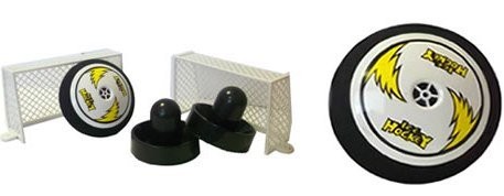 Состав: аэрошайба с мягкими краями, две биты и пластиковые ворота с креплениями.