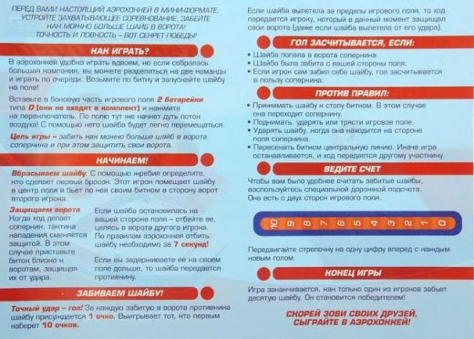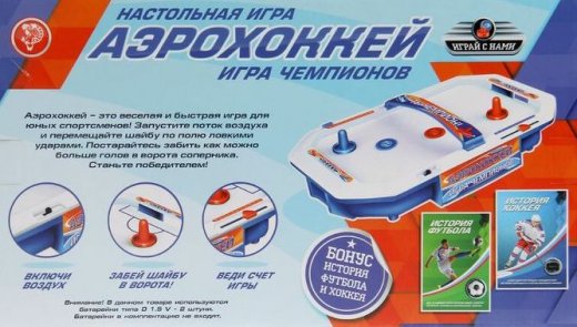 Состав: игровое поле, 2 битка, 2 шайбы, брошюра с историей футбола и хоккея, правила игры.