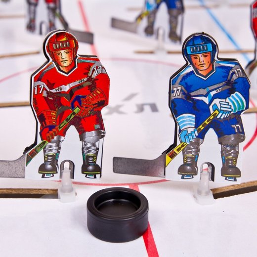 Игровое поле прекрасно умещается на небольшом столе. Хоккеисты управляются вращением и передвижением ручек с металлическими спицами.