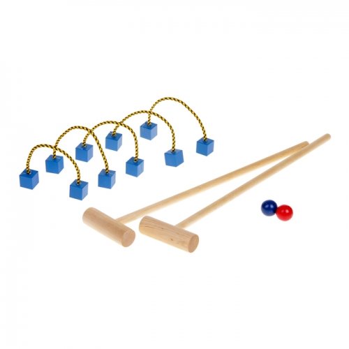 Необходимо установить ворота, задача игроков по очереди провести мячик через все ворота с помощью ударов молотка. Играть в детский крокет можно как на улице, так и дома. Игра хоть и подвижная, но безопасная для окон и техники.