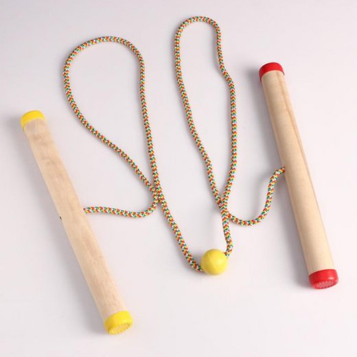 На концах веревочки привязаны 2 деревянных ручки-палочки, на середине веревочки закреплен деревянный шарик.