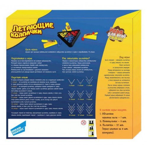 «Летающие колпачки» - это активная и веселая настольная игра в которой игрокам нужно с помощью специального пускового устройства закидывать колпачки на поле. При этом игроки имеют поля разных цветов и получают очки за различные ситуации на поле. Каждый стремиться взять как можно больше очков, ведь это условие победы в игре.