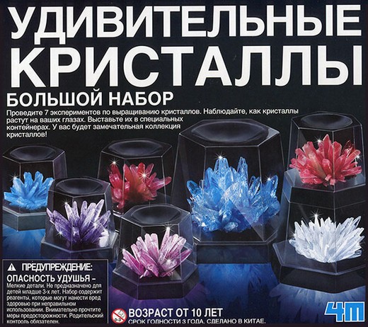 Кристаллы – это вещества, мельчайшие частицы которых размещены в определённом порядке. Поэтому при росте кристалла на его поверхности возникают плоские грани, а сами кристаллы принимают различные геометрические формы. Многие учёные, которые внесли большой вклад в развитие таких наук как химия, минералогия начинали свои исследования именно с выращивания кристаллов. Повторить путь известных учёных сможет и ваш ребёнок. В этом ему поможет большой научно-познавательный набор “Удивительные кристаллы” от бренда 4М.