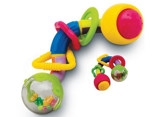 Погремушка-прорезыватель "Веселая радуга состоит из двух шариков и гнущегося разноцветного цилиндра, на который надеты три кольца, имеющих различные геометрические формы. Внутри игрушки маленький исследователь обнаружит множество разноцветных шариков, которые при потряхивании издают гремящие звуки. Ручка очень удобна для захвата маленькими детскими пальчиками, поэтому при помощи этой игрушки легко научить Вашего малыша удерживать предметы. Погремушка изготовлена из высококачественного материала, безопасного для вашего малыша.