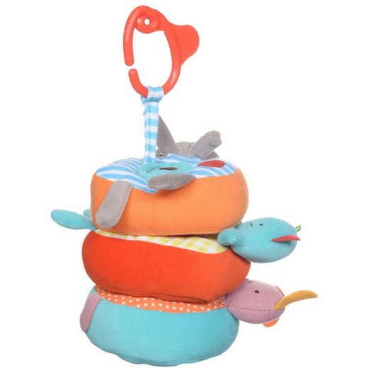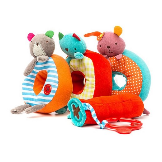 Погремушка "Пирамидка" состоит из 3 крупных колец, выполненных в виде забавных зверят, которые скрепляются цилиндром со специальным крючком, что позволит повесить игрушку-погремушку с вшитой пищалкой на коляску или кроватку. Элементы пирамиды выполнены из мягких материалов, благодаря которым их приятно держат в руках.