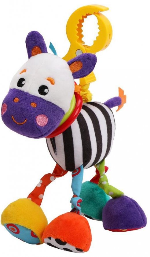В каждой лапке у зебры спрятана потайная шуршалка, которая издаёт очень приятный звук при каждом касании. Если потянуть игрушку на себя, держась за туловище или за лапки, она будет забавно вибрировать. На шее у зебры - 2 гремящих колечка.