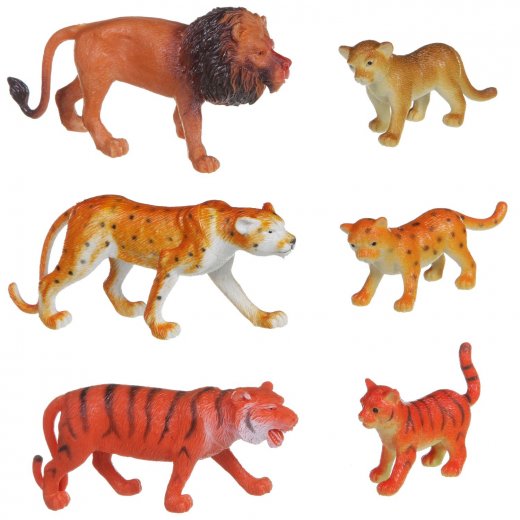 Набор животных "Дикие животные с детенышами 6шт" содержит в себе 6 фигурок зверей из семейства кошачьих.Эти млекопитающие отличаются своей ловкостью, быстротой и грациозностью. В наборе ребенок сможет найти не только фигурки тигра, гепарда и льва, но и их детенышей.