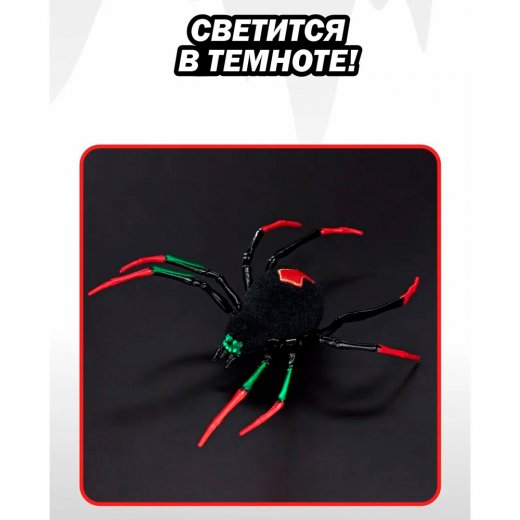 Паук выглядит реалистично. Тельце – мохнатое. Светится в темноте. Быстро ползает по ровной поверхности, благодаря множеству ножек, спрятанных на животе.