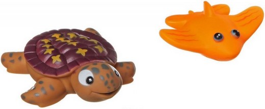 Забавные черепашка и скат имеют трогательный внешний вид и сделают пребывание ребенка в ванне во время купания похожим на увлекательную игру. Игрушки обладают ярким дизайном и, благодаря резиновому материалу, не тонут в воде, их можно сжимать, тренируя мышцы, тактильное восприятие и моторику. Две игрушки познакомят малыша с обитателями водной среды, он сможет узнать их названия и запомнить отличительные черты. Подойдет для игры детям с самого раннего возраста, начиная с первых месяцев жизни.