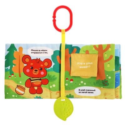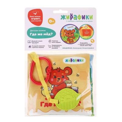 Мягкая книжка-подвеска Где же мед? Жирафики. Мягкая книжка-подвеска «Где же мёд?» познакомит малыша с одним очень милым медвежонком, который отправился в лес на поиски своего любимого лакомства! Чтобы крохе было интересно, эта история рассказывается в простом и весёлом стишке. Мишке можно помогать в поисках мёда, открывая окошки. Странички книжки шуршат: их так и хочется перелистывать пальчиками! На одной из страничек спрятан сюрприз — забавная пищалка, которая приведёт малыша в полный восторг. А мягкий прорезыватель из пищевого силикона поможет крохе в период активного роста зубок. Изготовлено из текстильных материалов, полиэфирного волокна и полимерных материалов.