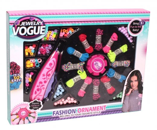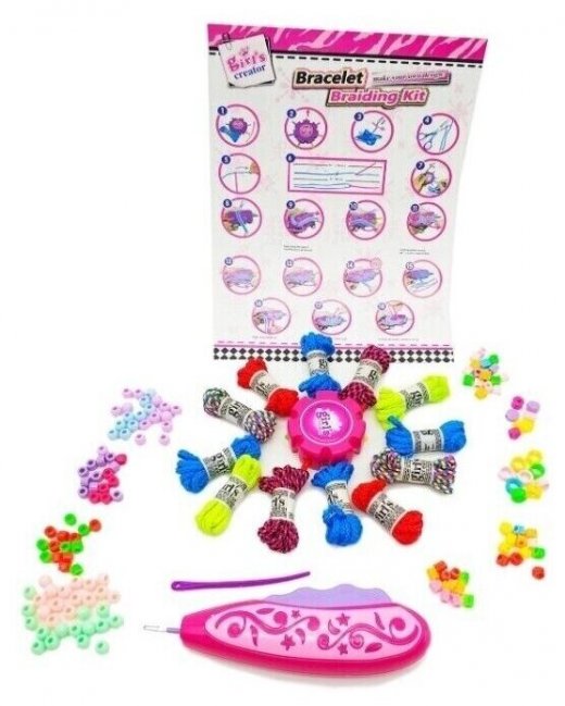 Состав набора: прибор для плетения украшений, разноцветные бусины, нитки, инструкция.
