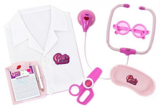Состав набора: сумка, халат, шприц, градусник, стетоскоп, аксессуары.