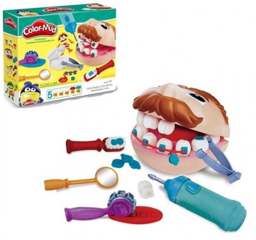 "Набор Дантиста Color-Mud" – это отличная захватывающая и познавательная игра для будущих стоматологов! Ребенок сможет лепить зубы из пластилина и вставлять их в рот пациента, лечить зубки, ставить брекеты, сверлить бормашиной, ставить пломбы и чистить зубной щеткой.