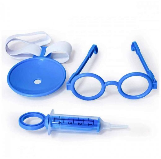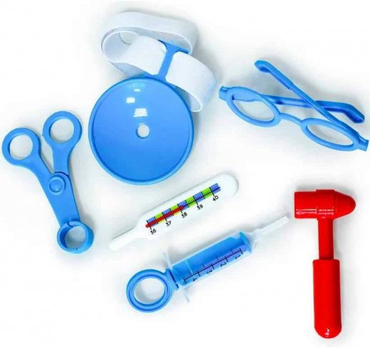В игровом комплекте малыши найдут очки, ножницы-зажим, молоточек, шприц и 3 ампулы, капсулы, мензурку, пинцет, налобный рефлектор, градусник, таблетки.