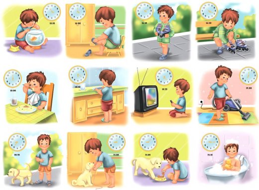 Перед вами игра для детей старшего дошкольного возраста, при помощи которой они не только интересно проведут свой досуг, но и смогут закрепить знания о режиме дня и умение определять время по часам, а также разовьют восприятие, внимание, память и мышление. Перед началом игры разрежьте карты по пунктирным линиям, у вас получится 48 карточек с сюжетными картинками. Обратите внимание на то, что на игровом поле части суток (утро, день, вечер, ночь) обозначены разными цветами.