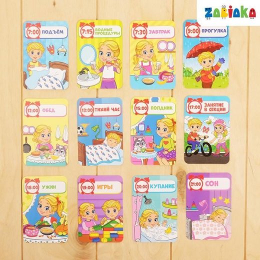 С обучающими часиками ребёнок научится определять время. А с помощью ярких карточек узнает о распорядке дня, запомнит месяцы и времена года.