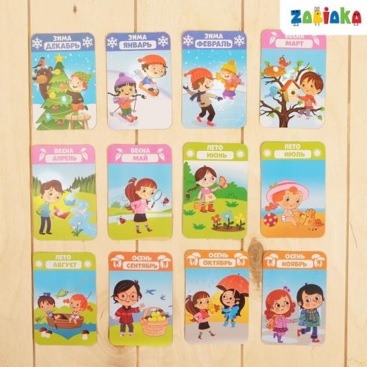 1. Разложите все карточки в один ряд от января до декабря. Объясните малышу, что на этих карточках изображен целый год. В году 4 времени года.