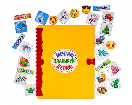 В набор входит деревянная папка "Мечтай! Планируй! Делай!" для хранения дополнительных фишек.