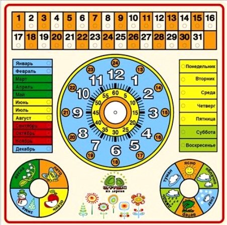 Рамка Календарь – это удобное наглядное пособие, которое можно использовать с детских садах и дома. Ежедневно заполняя такой календарь ребенок внимательнее присмотрится к особенностям природных явлений, таких как, изменения погоды, сезонность в годы или времена года, деление года на месяца, выучит дни недели. Рамка календарь - это отличный подарок для дошкольника. В центре есть большой циферблат с цифрами. Причем они есть по кругу в три ряда: в самом центре указаны минутки на желтом фоне, далее белые цифры показывают часы, а черные цифры в кружочках помогают определить время после полудня.