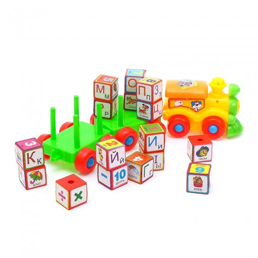 Чтобы ребёнок захотел сам изучать алфавит, достаточно подарить ему этот паровозик. Ведь он перевозит на своей платформе яркие кубики с буквами, которые станут наглядными пособиями во время обучения. Чтобы ребенку было проще запомнить алфавит, рядом с каждой буквой нарисован предмет, название которого с нее начинается. Когда малыш освоит буквы, то может перейти к составлению слогов и целых слов из них.