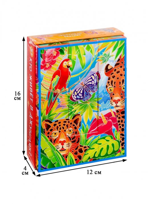 Набор состоит из 12 кубиков размером 4х4 см. Ребёнку нужно сложить картинку из 12 фрагментов. В качестве подсказки даны 6 картинок с изображением тропических животных. Картинка кладётся на дно коробочки, и ребёнок ставит на неё нужные кубики. Во время игры происходит знакомство с понятиями "часть и целое", развивается умение работать по образцу. Наклейки на кубики сделаны из качественной гладкой бумаги, которая не портится от игры.