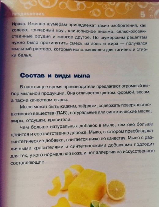 Особенность издания в том, что в нём раскрывается множество секретов мыловарения: как плавить специальную мыльную основу, как правильно её окрашивать и ароматизировать, как избавиться от пузырьков, как сделать формы своими руками.