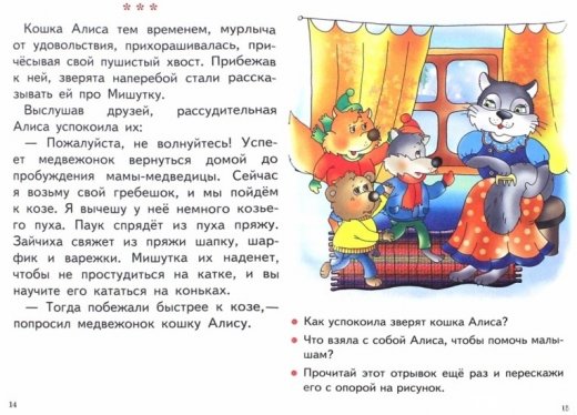 Текст в учебном пособии разбит на отдельные смысловые части, после которых ребенку предлагаются вопросы на понимание прочитанного. Они помогут ему целостно воспринимать текст и разовьют умение говорить полными предложениями. Многие словосочетания и предложения повторяются не один раз, что помогает развитию навыка чтения целыми словами, так как знакомый текст не вызывает затруднений.