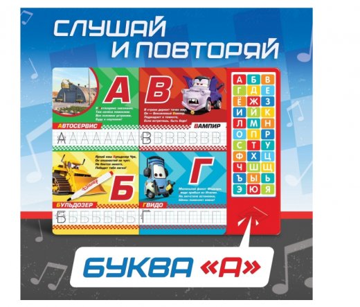 Нажимайте на музыкальные кнопочки и слушайте, как звучат буквы. Также внутри книги малыша ждут любимые персонажи, яркие иллюстрации, стихи на каждую букву и даже многоразовые прописи со специальным маркером!