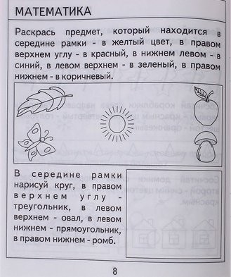 Перед Вами тетрадь с проверочными заданиями, при помощи которых Вы сможете оценить уровень развития Вашего малыша, определить, соответствует ли он возрастным нормам. В тетради Вы найдете три раздела: "Математика", "Развитие речи" и "Окружающий мир". Объясните малышу задание, предоставьте ему возможность выполнить его самостоятельно. Если ребёнок затрудняется, помогите ему. Обязательно похвалите малыша за старание, даже если Вы не очень довольны результатом. Если малыш не справляется с большинством заданий, значит ему необходимы дополнительные задания.