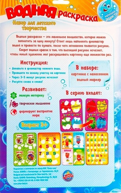 Теперь раскрашивать любимые картинки можно снова и снова! Чудо-раскраска становится цветной, после того как проведешь по картинке маркером с водой. Когда картинка высохнет - она опять становится белой и пригодной к использованию.