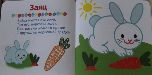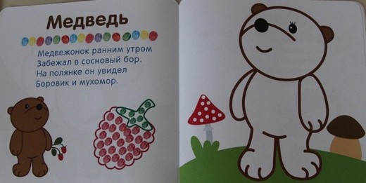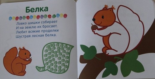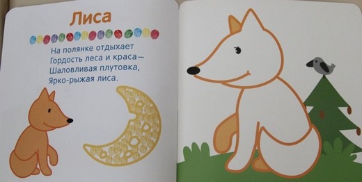 Рисовать предлагается пальчиками. Это развивает фантазию, мелкую моторику, интеллект. Замечательные картинки сопровождают веселые стихи, которые познакомят малыша с резвой лошадкой, кудрявой овечкой, хитрой лисичкой, веселой белкой и другими обитателями леса, зоопарка, деревни.