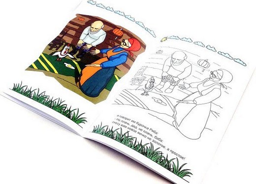 3d раскраска «Курочка Ряба» на первый взгляд похожа на обычную детскую сказку. Ребенок разворачивает первую страничку и видит две картинки. Одна из них — цветная. Ее создали профессиональные художники. Причем яркое, красочное изображение оживает в буквальном смысле этого слова, как только на него наведут любое современное устройство — смартфон, планшет, айпод. Картинка становится объемной и превращается в настоящий мультипликационный фильм. Чтобы картинки оживали, разработана специальная программа, которую очень легко закачать на любой гаджет. Над второй картинкой предстоит потрудиться юным художникам. Рисунок черно-белый, и каждый ребенок сам подбирает подходящие цвета и оттенки. Он имеет уникальную возможность проявить свои творческие способности. А наградой будет еще один мультфильм, который был создан при его непосредственном участии. Вот такая она, эта живая раскраска!