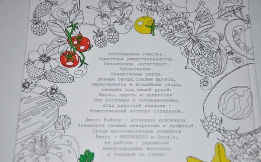 Воплощенное счастье. Радостная умиротворенность. Релаксация. Антистресс. Вдохновение. Невероятные цветы, дивные овощи, спелые фрукты, переплетаясь в волшебные узоры, оживают под вашей рукой. Прочь, грусть и депрессия! Мир роскошен и соблазнителен. «Сад радостей земных» - божественный восторг созидания. Джесс Вайнер – успешная художница. Знаменита своими акварелями и графикой.