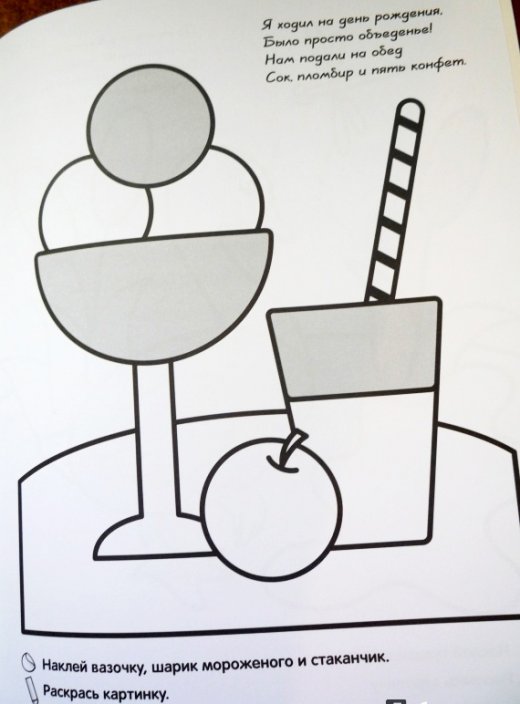 Прочитайте малышу короткое стихотворение, предложите назвать, что изображено на картинке, прочитайте задание. Вместе найдите на листе-вкладке нужные наклейки и помогите ребенку правильно приклеить их на картинку. А затем малыш с удовольствием раскрасит картинку яркими цветными карандашами или фломастерами.