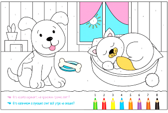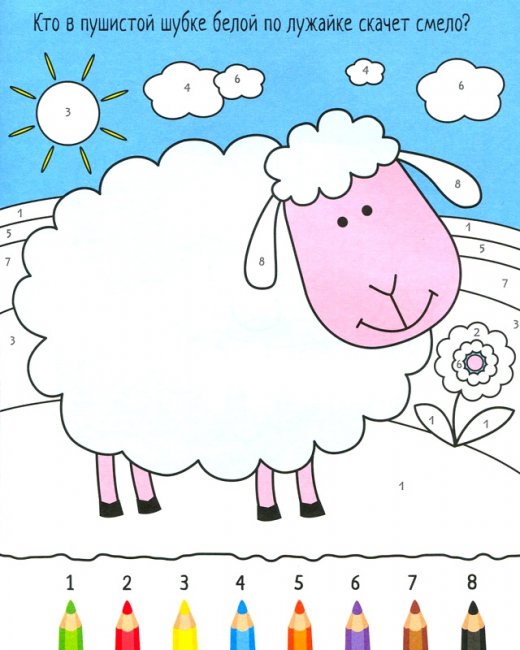 Чтобы понять, какой цвет необходимо выбрать, на рисунках есть цифры, а внизу - специальная табличка с соответствием цветов и цифр. Все развороты сопровождаются небольшими загадками, ответы на которые ребенок найдет на рисунках. Раскраска на долгое время займет малыша.